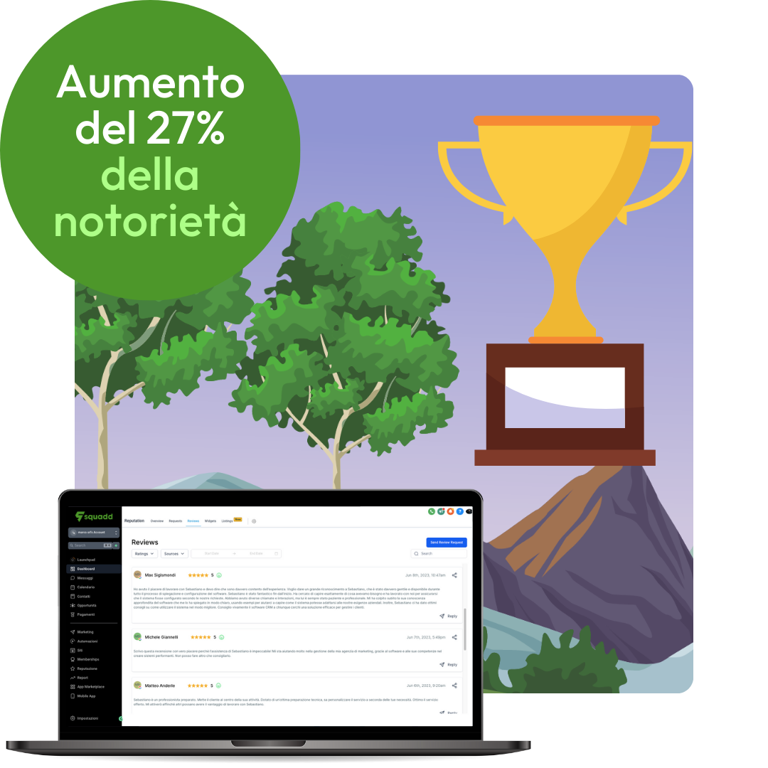 Con Squadd puoi inviare richieste di recensioni in automatico tramite SMS, Whatsapp ed email con un click, e persino fare follow-up sui clienti che non lasciano una recensione.